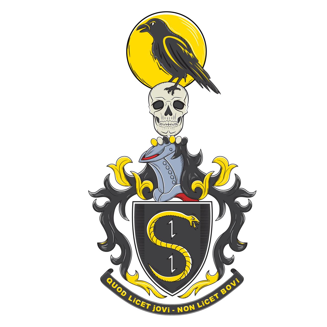 На чорному щиті золотий обернений вліво змій літерою S, обабіч якого – два срібні осадні гаки у стовп. Щит увінчує сталевий і підбитий червоним, повернутий вправо сталевий турнірний шолом. Бурелет – золото-срібно-чорний. Клейнод: срібний череп, на якому сидить чорний ворон, позаду якого золотий місяць. Внизу на чорній стрічці девіз золотом: QUOD LICET JOVI – NON LICET BOVI.